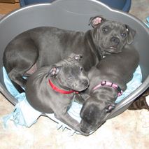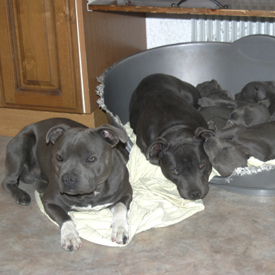 Jag heter Lena och tillsammans med min man Mikael planerar vi uppfödning av Staffordshire Bullterrier. Vi har två vuxna staffar idag och två valpar. Vi har själva importerat dem från England för att de har den vackra färgen "Blue".