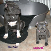 Vi har själva hämtat och importerat alla fyra och träffat föräldrarna. De var mycket fina och trevliga hundar. Diamonds pappa är ett riktigt muskelpaket, vilket inte framgår på bilderna. Det är samma sak med Diamond hon ser bättre ut i verkligheten än på bild.