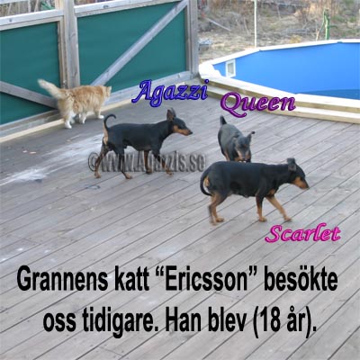 Han är snygg! Ståtlig, nyfiken har massor av kärlek att ge till alla. Han arbetar dagligen med sin flock...De måste läras allt möjligt. Han är snäll mot alla besökare, barn, andra hundar som kommer hit, valparna. Han vaktar oss och resten av flocken. Även barn som kommer på besök, tillhör genast flocken som han måste ha koll på, så han är en upptagen man. Han vill alltid vara med och se vad som händer när barnen leker. Ute på promenaderna har han därför svårt att möta andra hundar. Själv vill han fram och hälsa, men sedan anser han ju även att han ska vakta sin flock, så på promenad själv med mig går ju ett hundmöte bättre. Jag förstår hans ara problematik. Han är både välkomnande och vill hälsa på alla hundar samt känner att han måste vakta. Nu bara under senaste halvåret 2012-2013 har det hänt mycket med promenaderna. Det går så fantastiskt bra. Han kan nu gå lös och det har inte gått sedan han var unghund, för att han är smart, hittar hem själv, så han har inte tyckt att han behöver mitt sällskap antagligen. Han är så smart och har överlistat mig många gånger angående allt möjligt. Från enkla grejer som att han vänder på vattenskålen när den är slut. Först trodde han att det kanske fanns vatten på andra sidan, men han upptäckte ju att matte alltid hör när han vänder på skålen, så då får man den påfylld! Han är undergiven alla tikarna. Det är de som bestämmer. Precis som i de flesta familjer.Om någon tik är extra hungrig när maten delas ut kan han dela med sig. Likadant med hundbenen som tikarna gärna vill ha, men ibland vill han leka med tikarna och bara står och vaktar hundbenen för att retas. Det tycker han är kul. Han har överlistat mig många gånger genom att rymma från baksidan av trädgården, när han vet att jag inte ser och oftast tar det flera rymningar innan jag klurar ut hur han gör. Han rymmer för att han tycker att han behöver en extra promenad och vill undersöka hemma hos de andra grannarna. Speciellt har detta hänt om jag plockar med kopplen och vi inte går ut och går, som en gång när vi skulle åka på utställning. Då tog han sig en egen morgonpromenad och jag trodde vi aldrig skulle kunna komma iväg. Han är lydig på träningsplanen, men har inte fattat att ovillkorligen ska inkallningen gälla även ute på promenaden förrän hösten 2012. Nu lyder han och kommer. Han tycker så mycket om att träna olika moment inne eller på träningsplanen. Han vill gärna vara till lags. Han är den som kan sitta längst, ligga längst, stanna kvar längst. Han är så vänlig mot sina "tjejer" tikarna. Han sköter om dem, tvättar öronen, slickar dem i munnen och ansiktet. Han biter aldrig hårtunder lek. Han är himla duktig på att bara markera med munnen. Han är den som är allra mest försiktig med valparna. Han tycker så mycket om att titta på dem. Han slickar på dem och gör dem fina, men han är ju lite rädd för dem, åtminstone de första veckorna innan de går och springer. Ibland händer det att de försöker tutta på honom och det tycker han är underligt. Tikarna buffar för att leka med valparna på ett mera kraftfullt sätt än vad han gör. Han är så försiktig. Han är så kelig, vill bli ompysslad, borstad, få tänderna rengjorda. Han älskar att sova i sängen och de gånger han får det är han överlycklig! Från det att min dotter varit liten har han legat med henne på filten och varit med i alla lekar och observerat vad hon gör. Han har lekt med hennes dockor och själv varit dockan som hon kört i barnvagnen. Han åker gärna i dockvagnen och ligger i knät på dottern när hon läser för honom eller visar honom bilderna i fotoalbumet (som han inte kan se). Just nu när jag skriver detta ligger han i dockbarnvagnen och sover middag. Den är som gjord för honom. Han tycker om att åka bil, buss, tåg. Han har varit med mig överallt sedan han var valp. Valparna som han är pappa till är mycket lika honom. Han är en kramgo kille som gärna sover i knät eller ihop med någon av de andra hundarna. Hade vi haft katt hade han sovit där också. Han är den som välkomnade grannens katt "Ericsson" och fick honom att trivas här. Han lärde både Scarlet och Queen att Ericsson tillhör flocken. Queen var mycket förundrad när hon flyttade in. Det såg ut som hon tittade på både Agazzi och Scarlet som - Ser Ni inte att det är en katt!!! Han är mycket snäll mot andra hundar. Han är glad både i andra tikar och andra hanar. Allt som gör hans dagar roligare och intressantare. Han tycker om utställning och träning överhuvudtaget. Han gillar när det händer spännande saker.