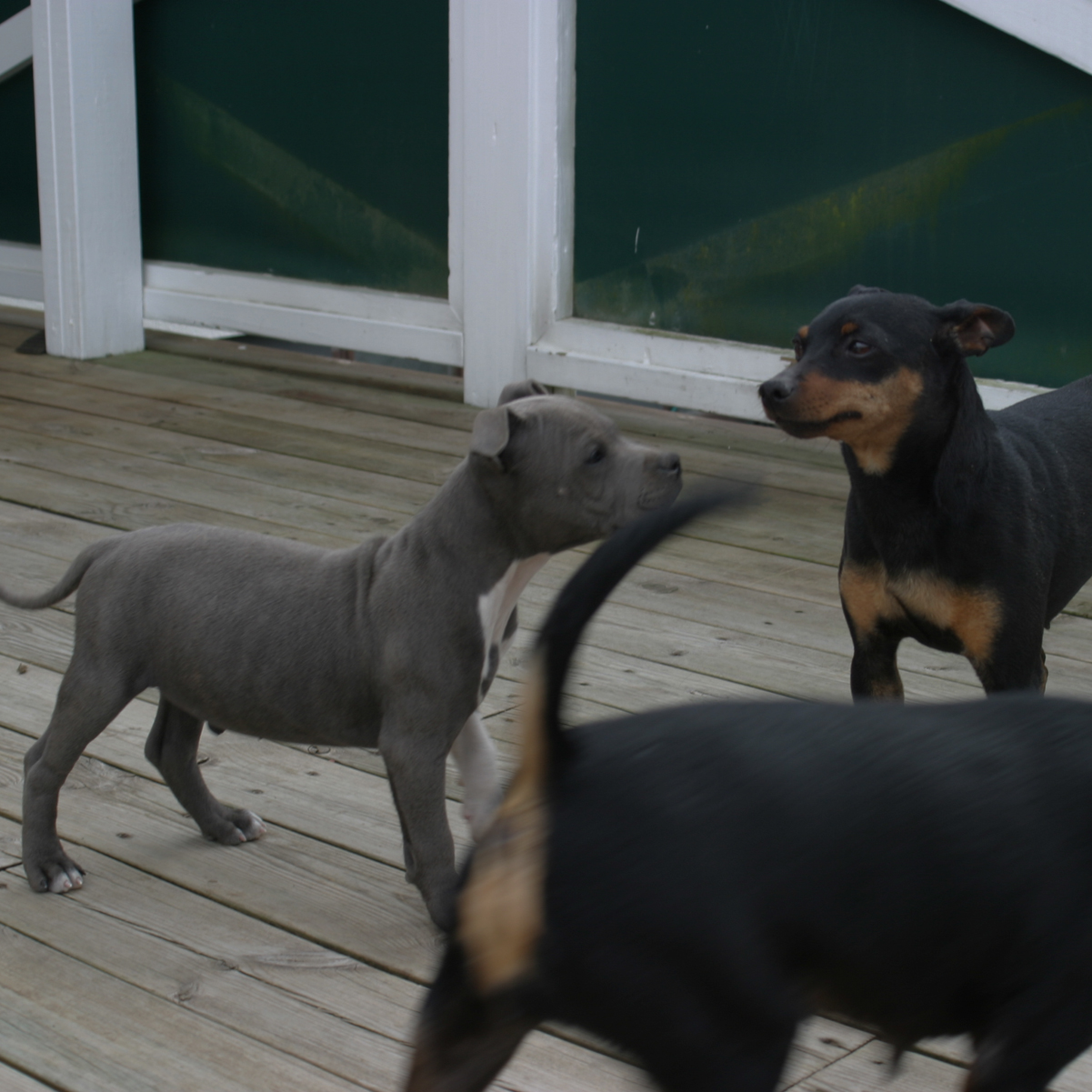 2013-04-04 Vi har haft fullt upp med att få alla nya hundarna att lära sig allt grundläggande. Promenaderna fungerar fantastiskt bra nu och har gjort det senaste halvåret. Ballerina tycker fortfarande mest om de nya staffarna som nu börjar lämna den valpigaste åldern. De är ju annorlunda på många sätt än hur en dvärgpinscher är och som tur är har inte Ballerina lärt sig deras små hyss än. Däremot är hon med hela tiden och tittar vad det är de gör.