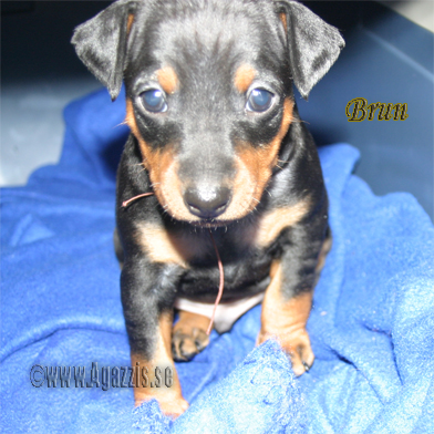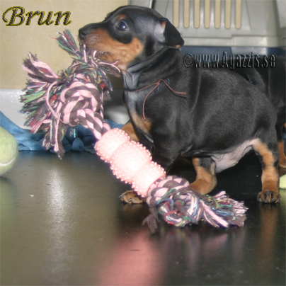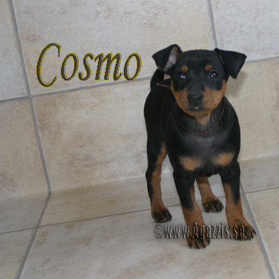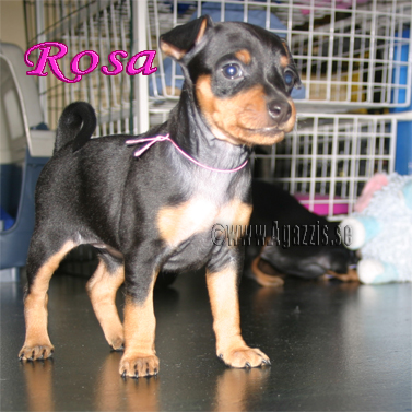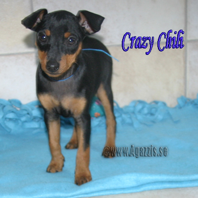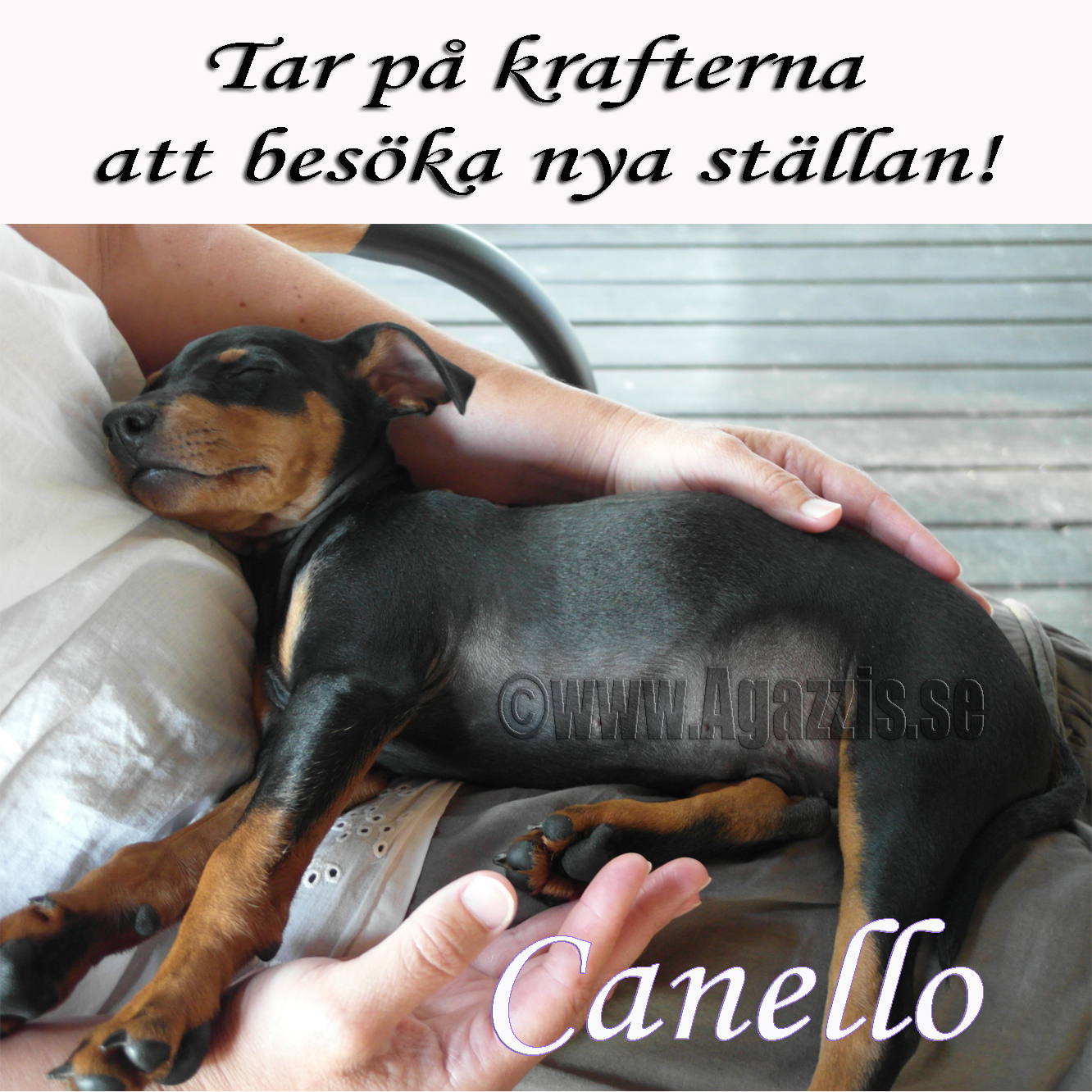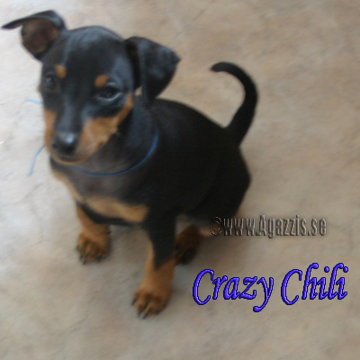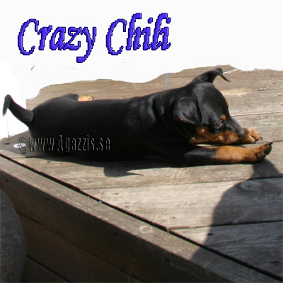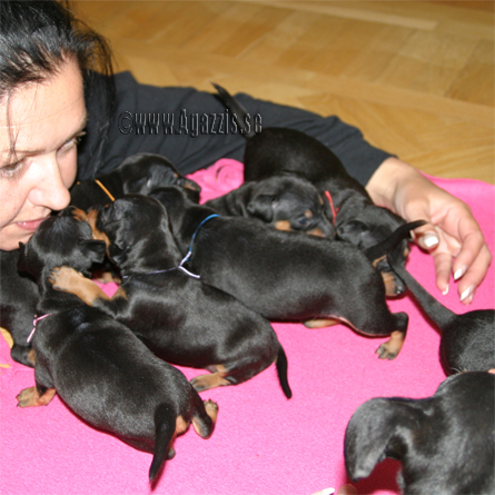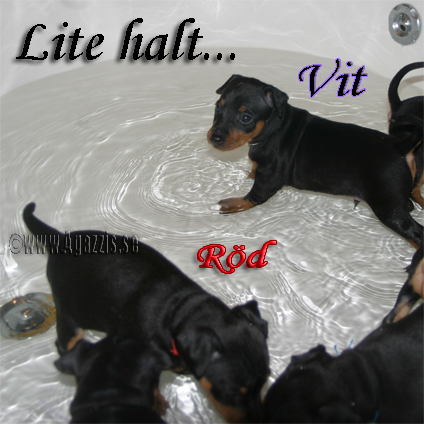 Åttonde veckan Nu har valparna veterinärbesiktigats. Chico och Cosmo fick anmärkning på små navelbråck, alla andra fem valpar klarade sig utan anmärkningar. Veterinären trodde att de små navelbråcken skulle gå tillbaka av sig själva eftersom de var små. Navelbråck räknas mer som ett skönhetsfel om det inte går tillbaka av sig själv. En valp ur tidigare kull fick ett ljumskbråck vilket jag tyckte var tvunget att åtgärda för att veterinärerna har rådfrågat flera, (även denna gång) sa att ett ljumskbråck kan orsaka att hunden får ett tarmvred som är ett akut tillstånd som måste akutfixas och uppmärksammas detta inte kan hunden dö. Medan ett navelbråck som jag förstår inte skapar något akut tillstånd som kan ge hunden besvär. Navelbråcken kom för några dagar sedan. Vi har inte sett något tidigare och det orsakas av en tunn bukvägg som gör att fett och har man ett stort navelbråck, så kan även tarmarna komma ut där, men det är inte möjligt i de här fallen. Finns valpar som föds med tarmarna utanpå magen t.e.x. Värre vore om en valp hade ett inre fel som inte syntes eller märktes vid besiktningen. Usch vad hemskt! Idag är jag glad att det gick så bra ändå. Klart man blir ledsen, men det är bara att ta nya tag och försöka ta reda på mer vad man eventuellt kan göra. Chico hämtades igår och hans navelbråck var lite större än Cosmos som jag tror går tillbaka snart. Chico och Cosmo är de valparna som hela tiden varit hungrigast och ätit mest, sprungit fortast fram till matskålen, ätit fortast och varit störst. Min teori är att de någon eller några dagar ätit för mycket så att bukväggen varit i press och då har detta uppkommit. Därför övervakar jag nu matningen och tar bort dem för att de andra ska hinna äta mer. kortare stunder. Efterhand Den rosa t.e.x har alltid minst bråttom fram till matskålen och hon är minst... Något samband borde det ha. Får inte bukväggen mera press, så bör det hjälpa till och att massera lätt på navelbråcket skall eventuellt hjälpa säger veterinärer och när man söker på nätet. Alternativt står jag för operation när Chico blivit fullvuxen om det blivit större. Cosmos ägare ville inte ha honom eftersom han inte gick igenom veterinärbesiktningen utan anmärkning. Min dotter Jenny och Sara blev överlyckliga över att få ha kvar deras gullegris Cosmo längre. Jag tänkte se om det kanske faktiskt blir bättre på någon vecka eller så. Jag har tagit bilder på hans lilla navelbråck där jag lätt kan putta tillbaks navelbråcket med ett finger, så att ni får se. Chicos gick inte att med fingret putta tillbaka, men trots det så trodde veterinären att det skulle gå tillbaka. Vaccinationerna gick bra och trötta var de efter veterinärbesöket och en kort bilresa. De sov i princip hela eftermiddagen. Nog om detta. Veckan har annars varit bra och de busar och leker och har så roligt. Det är så fantastiskt härligt att se dem njuta av solen. Dvärgpinschern är en soldyrkare. På fredag ska jag på utställning med Agazzi och Queen i Tvååker. Samma dag skall Carezza, Chicca och Charly hämtas, så det blir en hektiskt dag och Ballerina och jag ska även hinna på valpkurs. Jag vet inte hur jag tänkte där när jag bokade utställningen i Tvååker. Tur att det är sommarlov med fem andra hemma som kan hålla ställningarna. Hoppas att alla nya ägarna tycker om hembakat och bada i vår pool! Det ska komma fler bilder från den här veckan, men det är lite mycket nu...Canello,Crazy Chili ska stanna en vecka till och Cosmo får vi se hur länge det blir.