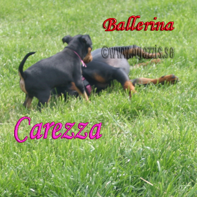 Sjätte veckan Den här veckan har valparna varit ute till en början kortare stunder. Efterhand har de varit ute längre. De tycker att det är så roligt att vara ute på gräset och att vara med de vuxna hundarna. Ballerina är den som tycker att valparna är roligast. Hon börjar också slappna av mer och mer och ligger ner på golvet eller i gräset och leker med valparna. Vi har haft oanmält besök av Svenska Kennelklubbens kennelkonsulent. De besöker kennlar för att se att alla hundar och om man har övriga djur har det bra. Vi blev godkända. Det kändes bra och var ett trevligt besök. Hon tyckte att det verkade som att alla hade det bra. Nu har även valparnas stamtavlor kommit och valparna heter: