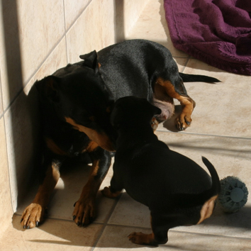 Den här veckan flyttade Ballerina och Queen ut i sommarhuset för att Ballerina är nu parad och jag vill att hon får lite lugn och ro, så att hon får egna valpar denna gången. Hon leker och leker med den lilla valpen. Allt går i och för sig bra, men för Ballerinas skull så fick Queen följa med. Scarlet och Fatima har det bra själva i valprummet och mamma Scarlet är en lika bra lekkamrat till Fatima som Ballerina var. Nu är det full fart på Fatima som hon ska heta den lilla valpen. Hon var riktigt uppmatad med all mjölk som Scarlet hade, men nu börjar hon springa av sig alltihopa. Äter bra gör hon. Helst vill hon äta samtidigt med Scarlet ur samma skål som henne även om jag ställer in två skålar till dem, så äter de ur en först och den andra sedan. Fatima och Scarlet har det bra trots värmen som är nu. Den här veckan skickade jag in namnet till stamtavlan och väntar på att den ska komma.