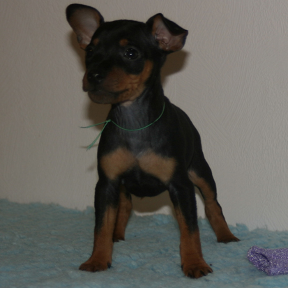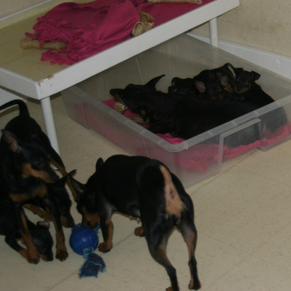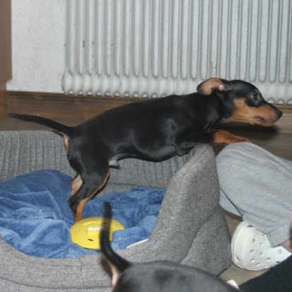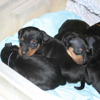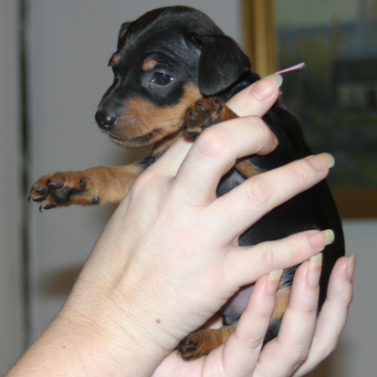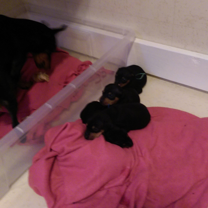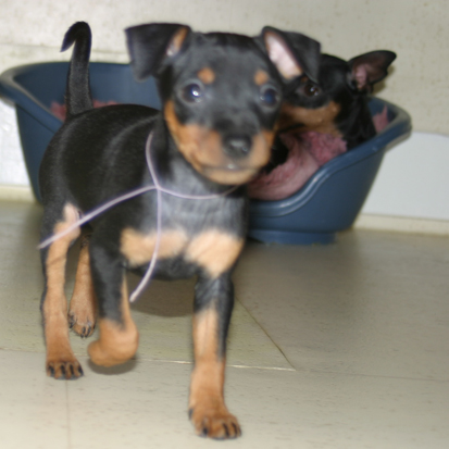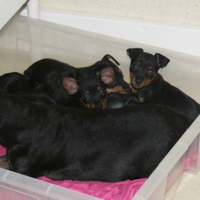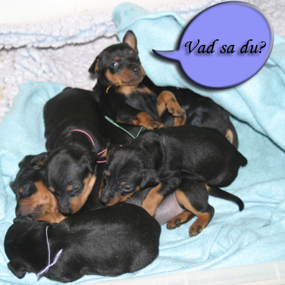 I början när de kom så var nog valparna trötta för de låg i en hög en bra stund och sov. Efter en stund fick de se att de kunde både gå bra och fort framåt på golvet. I och med att de började äta, så traskar de runt i rummet och är mycket mer nöjda en tidigare. De busar med varandra och undersöker leksakerna. När helgen kom så fick vi besök av familjen som äger Cosmo ur C-kullen. De hjälpte mig att bada och fota valparna och vi pysslade med dem hela helgen. Bada tyckte de om valparna och som vanligt är mamma alltid med vid första badningen. Jag tror att när mamman är ed i badet och de får tutta i badet då känns ju allt bra och tryggt. Vi använder ytterst lite schampoo och de kommer sköljas av med vatten de närmast veckorna och bara gå i badet för att vänja sig vid vatten. Man ska inte schamponera för ofta. Dottern där i familjen heter Joline, vilket var himla roligt att tiken i J-kullen fick heta. För Cosmos familj och dottern Joline kommer ibland på besök hit utöver kennelträffarna och hon älskar dvärgpinschrarna och följer allt på hemsidan om alla valpar. Nu är namn inskickade till svenska kennelklubben och de har fått sina registreringsnummer och stamtavlorna.