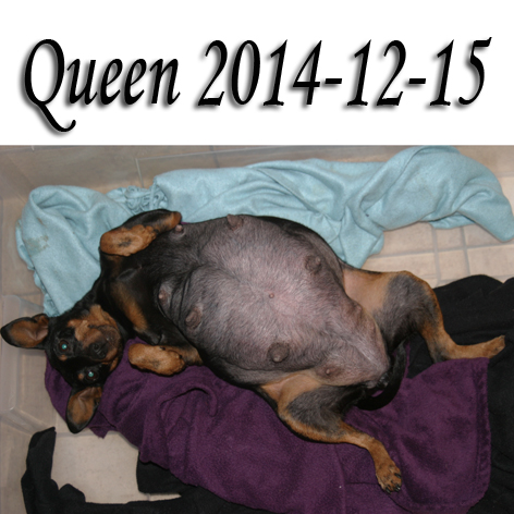 Det kändes långt att vänta fyra dagar mellan Scarlet och att Queens valpar skulle komma. Trodde verkligen att de skulle komma under natten före, hon var uppe, gick omkring och ville ut och sedan tillbaka och lägga sig i min säng och sedan tyckte hon att det var för varmt under täcket. Dagen före hade vi nått bottentamperaturen trodde jag på 36,2, men på morgonen före de kom var den på 36,1 och däremellan steg den ju till över 37 grader. Fantastiskt lätt har det gått för henne, trots att nästan alla kommit med rumpan före den här gången. Alla har börjat tutta inom 15 minuter trots att de varit lite mindre än hennes tidigare kullar i genomsnitt. Eftersom jag har två kullar samtidigt och jag planerar att ha valpar och mammor ihop efter tredje veckan i det stora rummet, så har jag gett de här band i motsatta färger till Scarlets kull för att inte blanda ihop dem.