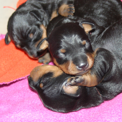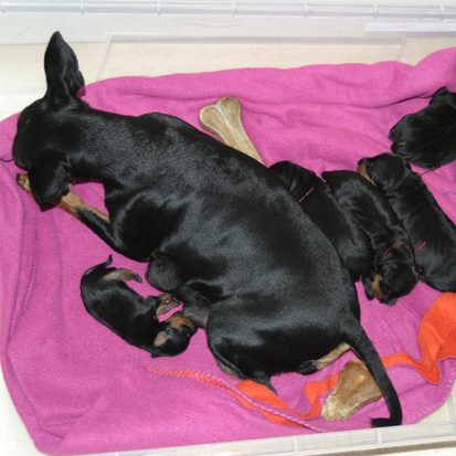 De föddes på dag 59 och det var inget vi väntade oss, eftersom jag tempat flera dagar innan och den inte gått ner. Vi tog med henne och valplådan till sängen när vi skulle gå och lägga oss på kvällen. Hon började böka och greja i lådan. Jag trodde bara hon höll på att bädda och fixa för att hon inte var nöjd på det sättet hon låg för magen var ju enorm. Efter en stund när hon fortfarande höll på och greja i lådan kollade jag ner och såg att det har nog satt igång. Dottern och Joline (har hanen Cosmo ur C-kullen) som var på besök hann inte in och se den första valpen komma. Vilket bara var en minut senare och de hade gått och lagt sig i rummet bredvid. Valpningen gick som vanligt himla smidigt och alla valpar mår bra och var pigga när de föddes och började tutta inom tio minuter. Vi somnade allihop i sängen runt valplådan jag, dottern Jenny och Joline.