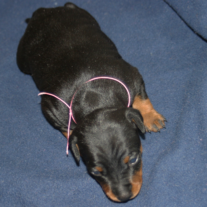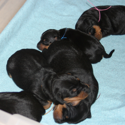 Den blå valpen är den första valp jag haft som gått ner i vikt till dag två. Då vägde han 114 g- Han går sedan dess stadigt uppåt, så från den vikten har han gått upp 59 gram. De andra valparna har en enorm viktuppgång istället. De är som runda klot. Alla valparna är pigga och kravlar runt i lådan. Den blåa valpen är ju nu bara hälften så stor, så han måste kollas att han får möjlighet att komma fram och äta så han inte blir bortskuffad. Han har inga problem att ta sig fram för att äta mat trots att han är mindre, så det går så bra så. På dag elva öppnade den oranga valpen ögonen, därefter så var det den blåa, den röda och den bruna och sist var den rosa valpen.
