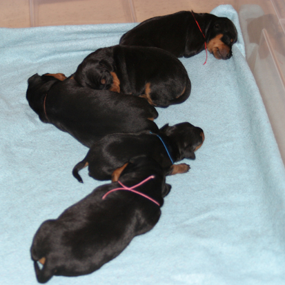 Alla valparna och mamma mår bra. Den lilla blå har haft det lite tufft i konkurrensen mot de andra och gick ner lite i vikt den första dagen, men nu är alla på väg uppåt. Den blå ligger efter, så den blir lätt bortputtad av de andra som nu på femte dagen väger nästan dubbelt så mycket som den. De äter på ordentligt. Kravlar runt och har det mysigt i valplådan. Queen är som vanligt en duktig mamma och pysslar om dem. Det här är dock första kullen som Queen har vågat lämna redan första dagen för att gå ut och kissa. Tidigare kullar har hon hållt sig i två dagar innan hon har gått ut.