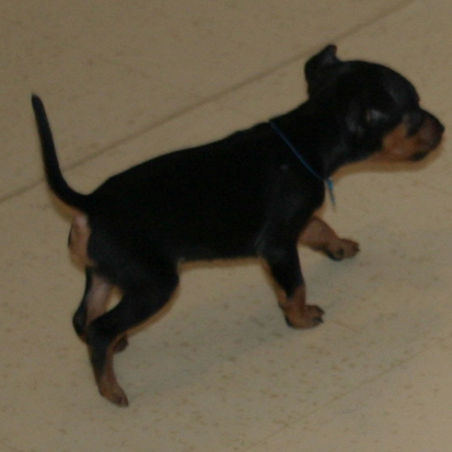 Under femte veckan:Nu börjar det bli fart på de små valparna. I slutet av vecka 5, ska jag ta nya vikter på valparna. Den blå har inte samma viktuppgång som de andra valparna, men han äter bra och med god aptit, så vi får hoppas och se hur det går framåt. Den här veckan har mamma Queens dotter "Ballerina" fått vara med inne i valprummet. Hon är vår bästa lekmamma och hon har så roligt med valparna. De första dagarna trodde hon nog att hon var mamma till de små. Hon pysslar och tvättar dem. Hon ställer sig på golvet och förväntar sig att de ska tutta, men hon har ju ingen mjölk nu. Valparna blir också lite förvånade över att det inte går. Ballerina fick komma in till valparna för att de ska socialiseras med andra hundar och för att Ballerina börjat löpa och inte kan vara med hanen Jasper som jag har hemma. Nu har jag dock bytt och tagit in Jasper till valparna istället för att Harmony som är Ballerinas dotter också började löpa och då var det enklare att Ballerina fick gå tillbaka till gruppen med Harmony och Scarlet. Jasper kommer bli en bra lekkompis han också. Det är mycket lek i honom som snart är 9 mån.