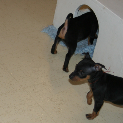 Nu kravlar vi in och ut ur lådan och tar oss runt på golvet i valprummet. Vi busar lite med varandra och har roligt. Vi låter och har börjat äta uppblött valpfoder. Det tycker vi är gott. Vi tuttar fortfarande på mamma. De är för härliga och gosiga och blir lyckliga av att man kommer in och sitter hos dem. De börjar busa mycket med varandra nu. De ligger fortfarande i en hög och sover. De gillar att sova ihop.