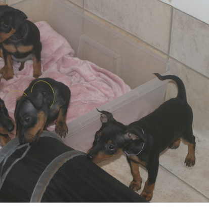 Nu börjar valparna bli lite roligare och är vaknare lite längre. De leker med varandra och tar sig i och ur lådan.